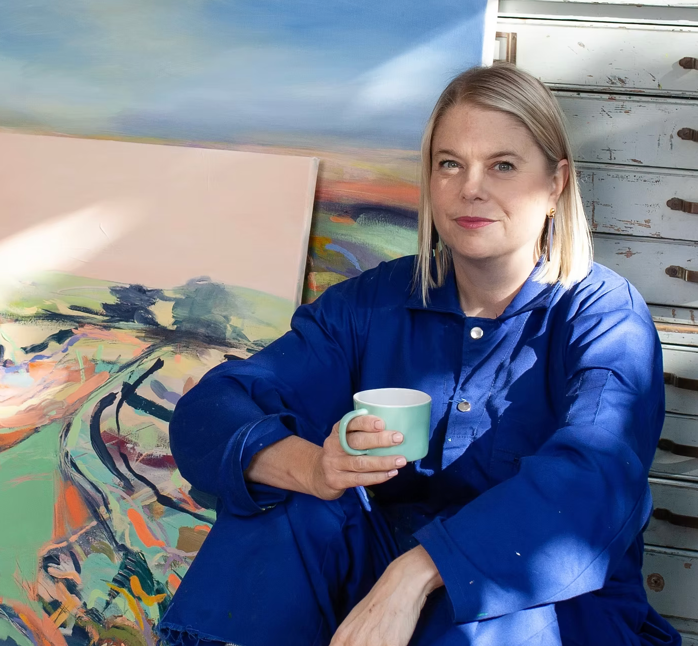 Her paintings respond intuitively to the landscape, capturing the elemental essence of a place rather than a literal depiction. Sometimes she hones in on a single flower, other times she embraces the full expanse of a landscape, allowing light, colour, and atmosphere to guide her brush.